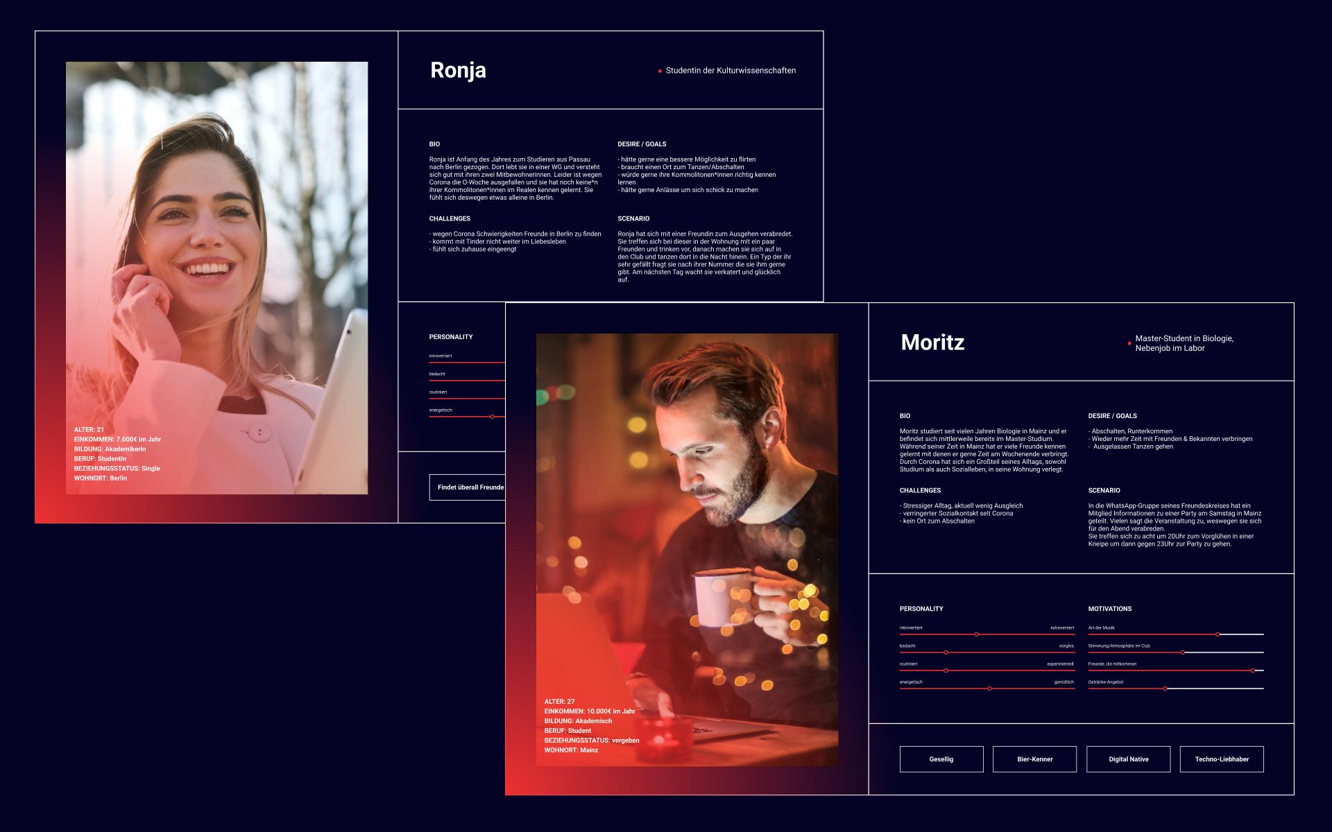 Nach einer Besprechung der entstandenen Skizzen kombinierten wir verschiedene visuelle Elemente zu einem stimmigen Gesamtbild. Farblich entschieden wir uns für ein dunkles Violett als Hintergrundfarbe, sowie für ein knalliges Pink als Akzentfarbe in Anlehnung an die Farben der Lichter eines Clubs. Icons und Schrift werden in Weiß dargestellt. Als Display-Schrift verwenden wir die Orpheus Pro von Canada Type und als Fließtextschrift die Degular von OH no Type.
